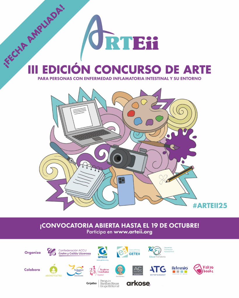 Te invitamos a participar en la III edición de ARTEii, el concurso de arte para personas con Enfermedad Inflamatoria Intestinal y su entorno. Si vives con EII o formas parte de su universo como familiar, amistad, pareja o profesional…¡exprésate a través del arte y visibiliza tu experiencia!